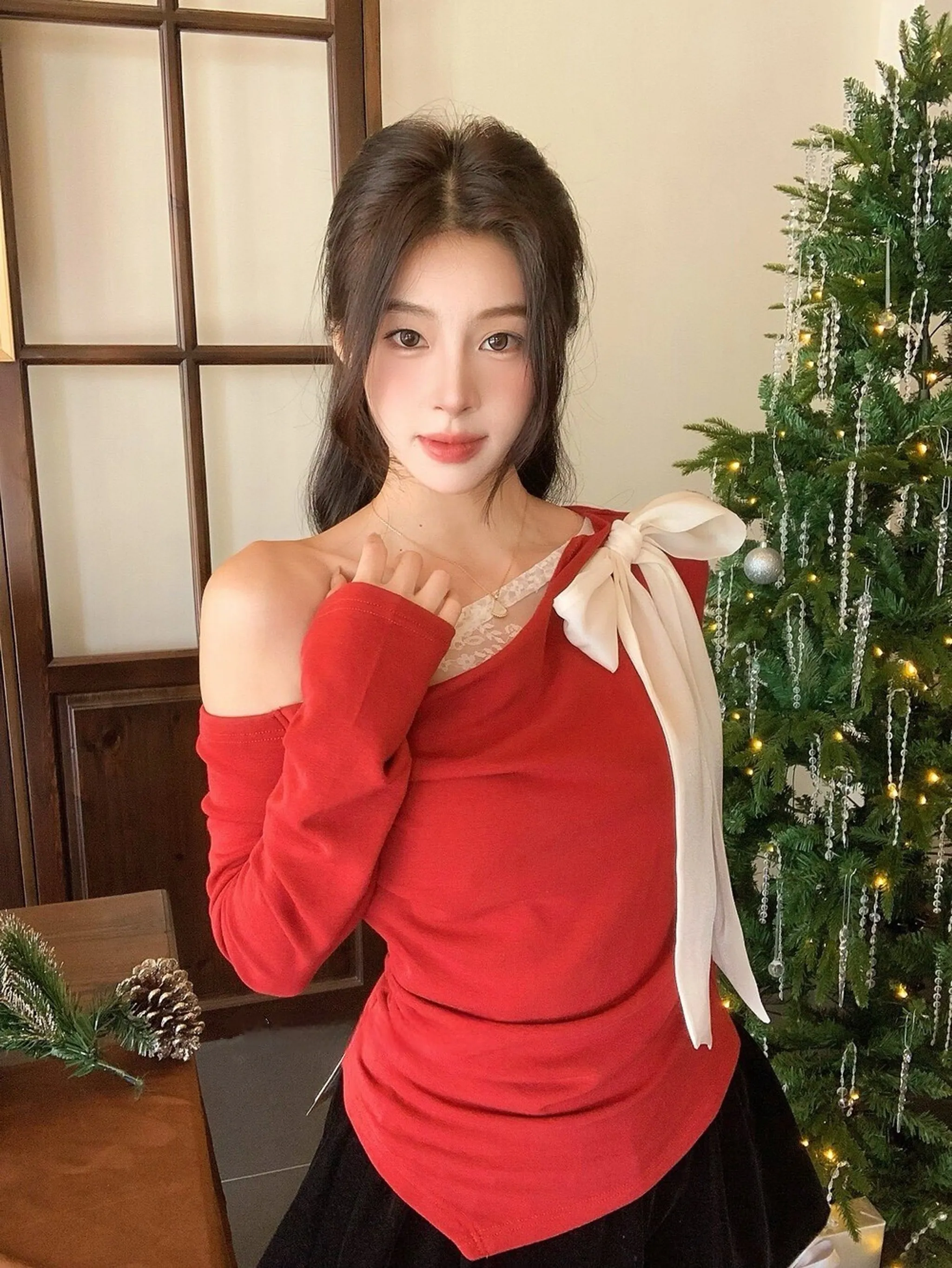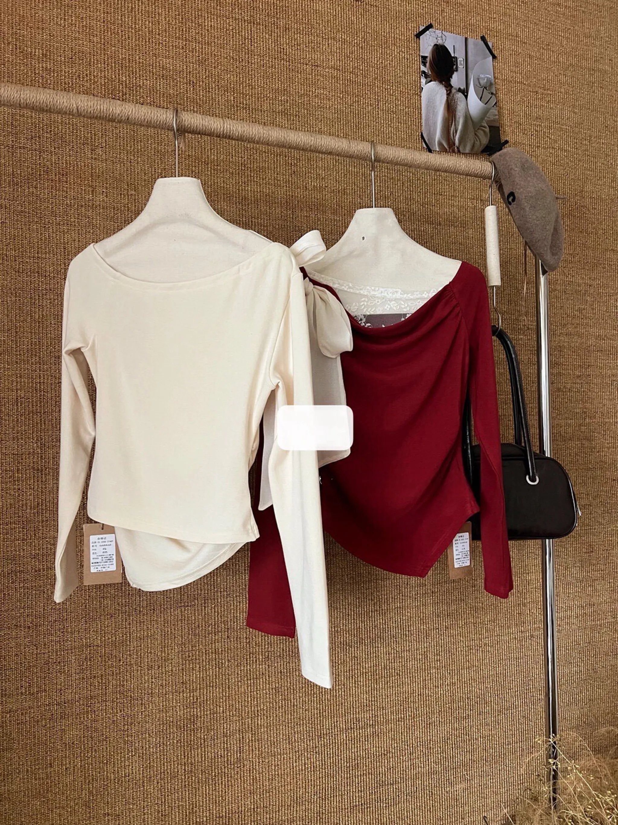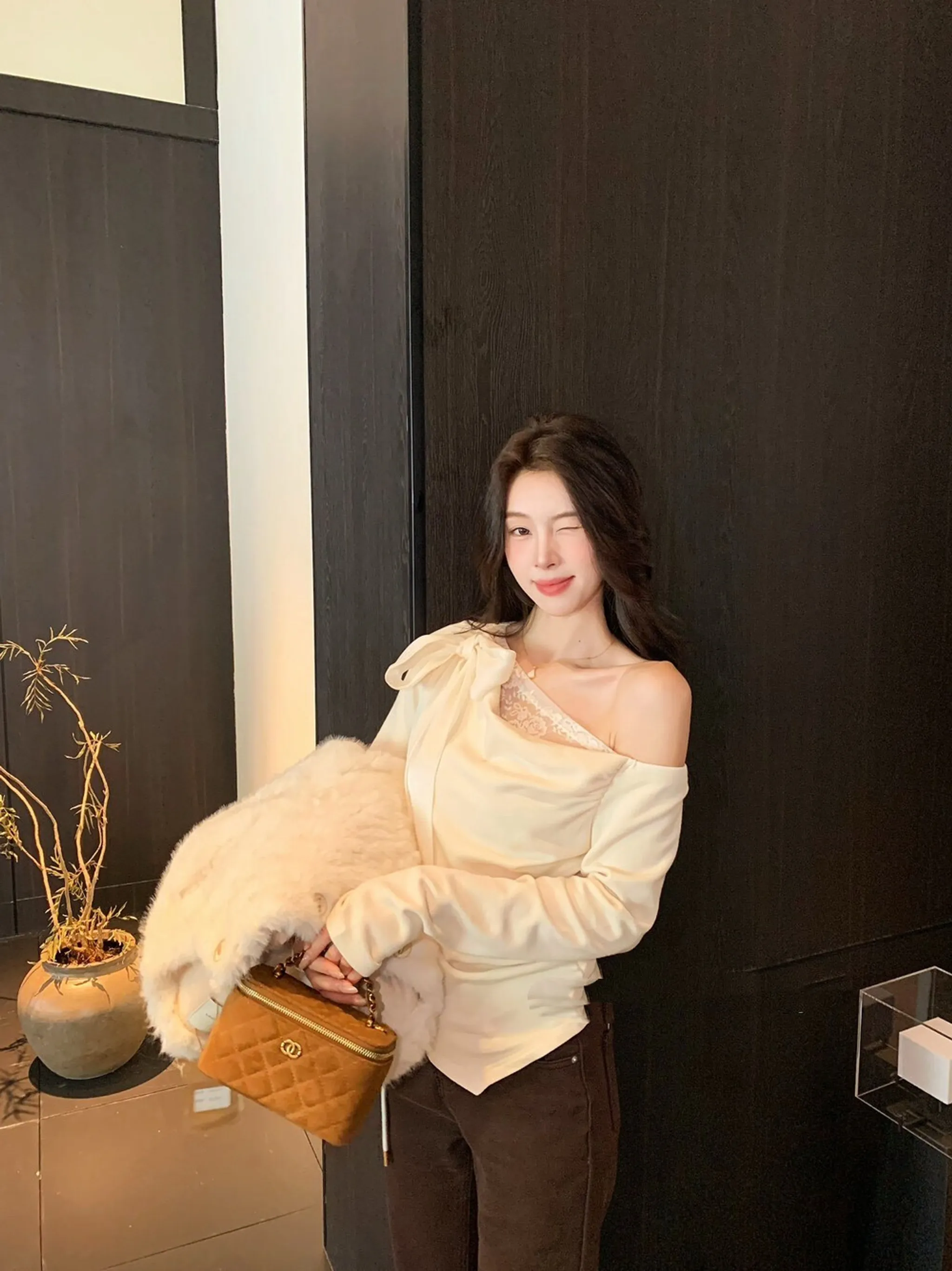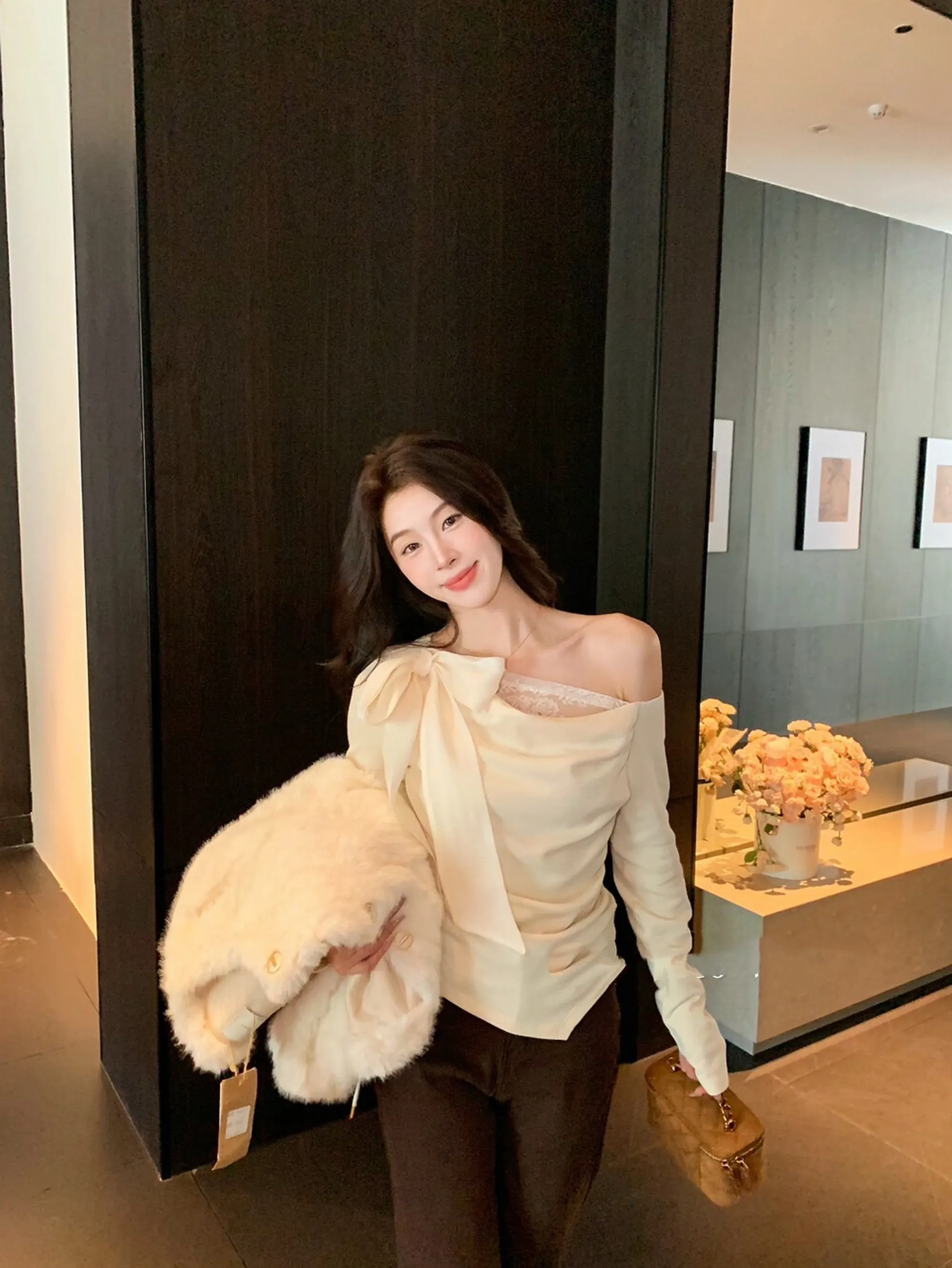 12/1收單-蕾絲蝴蝶結斜領上衣