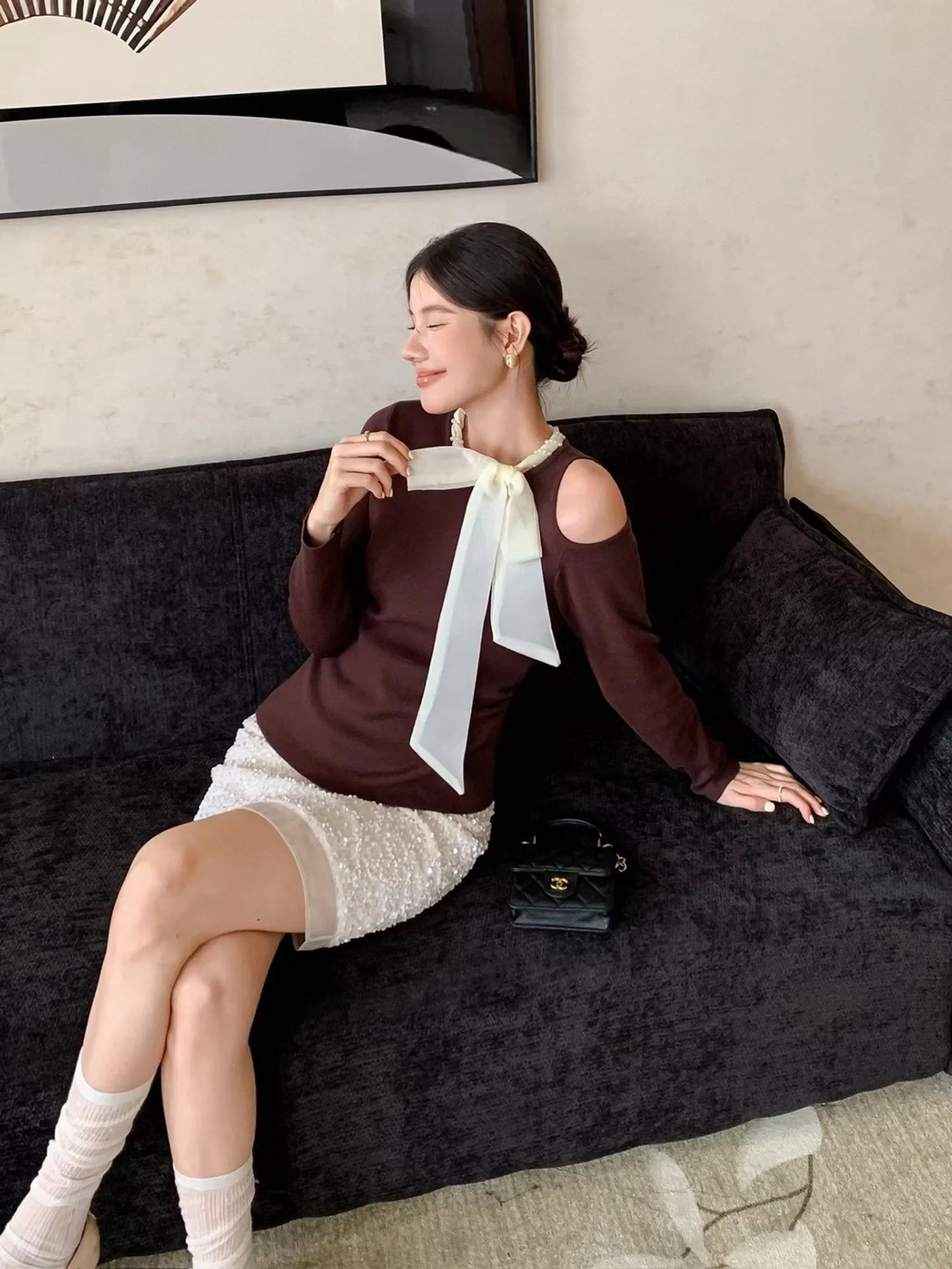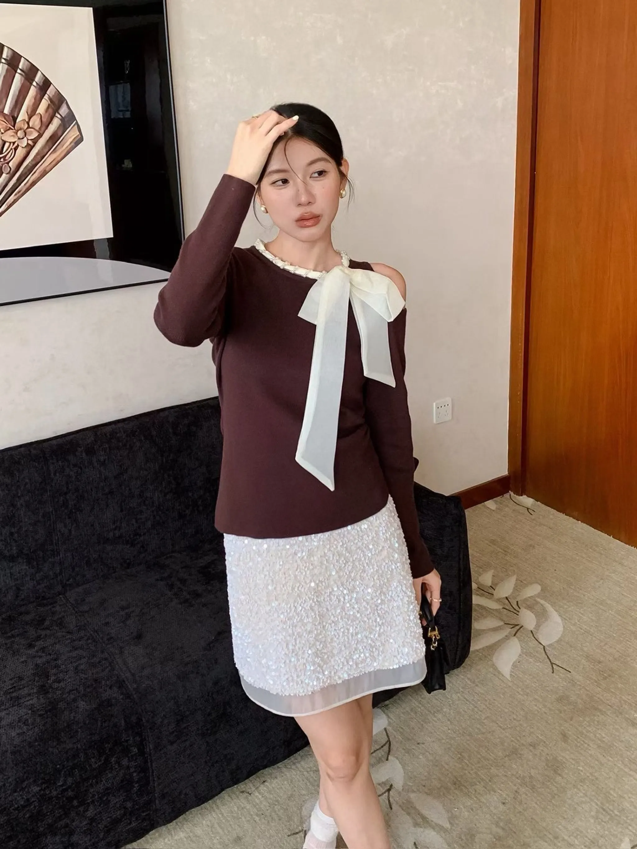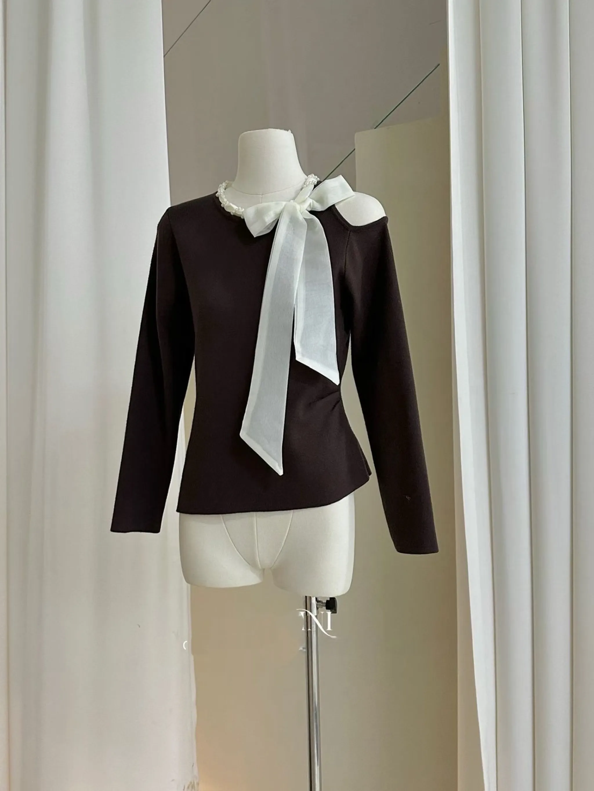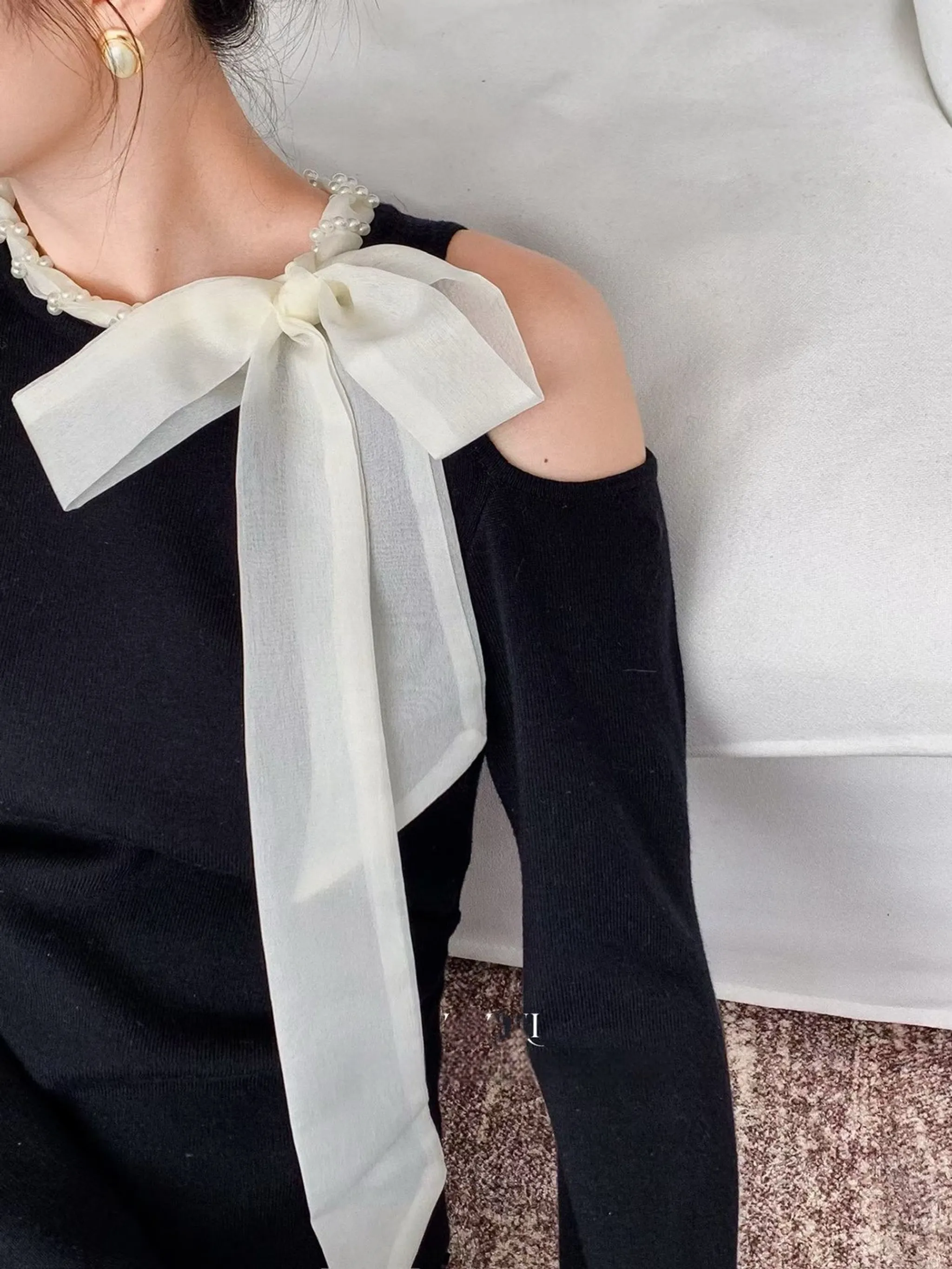 12/20收單高訂家-法式絲帶珍珠露肩上衣