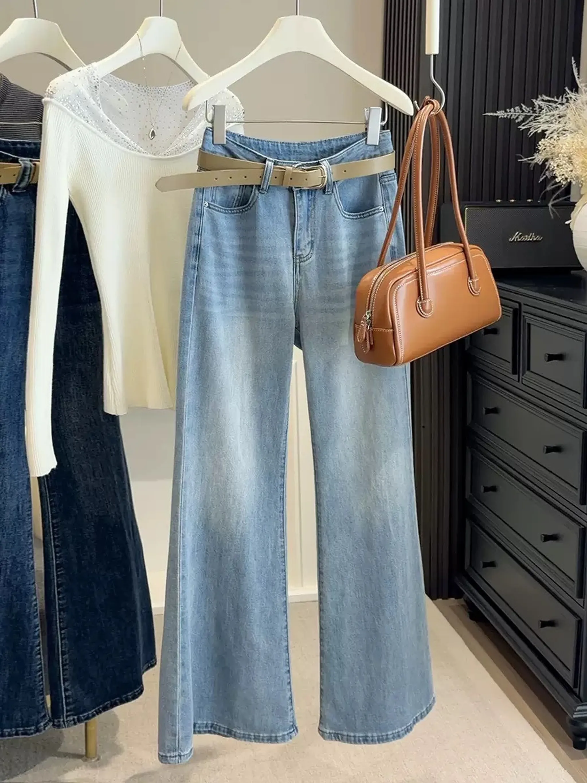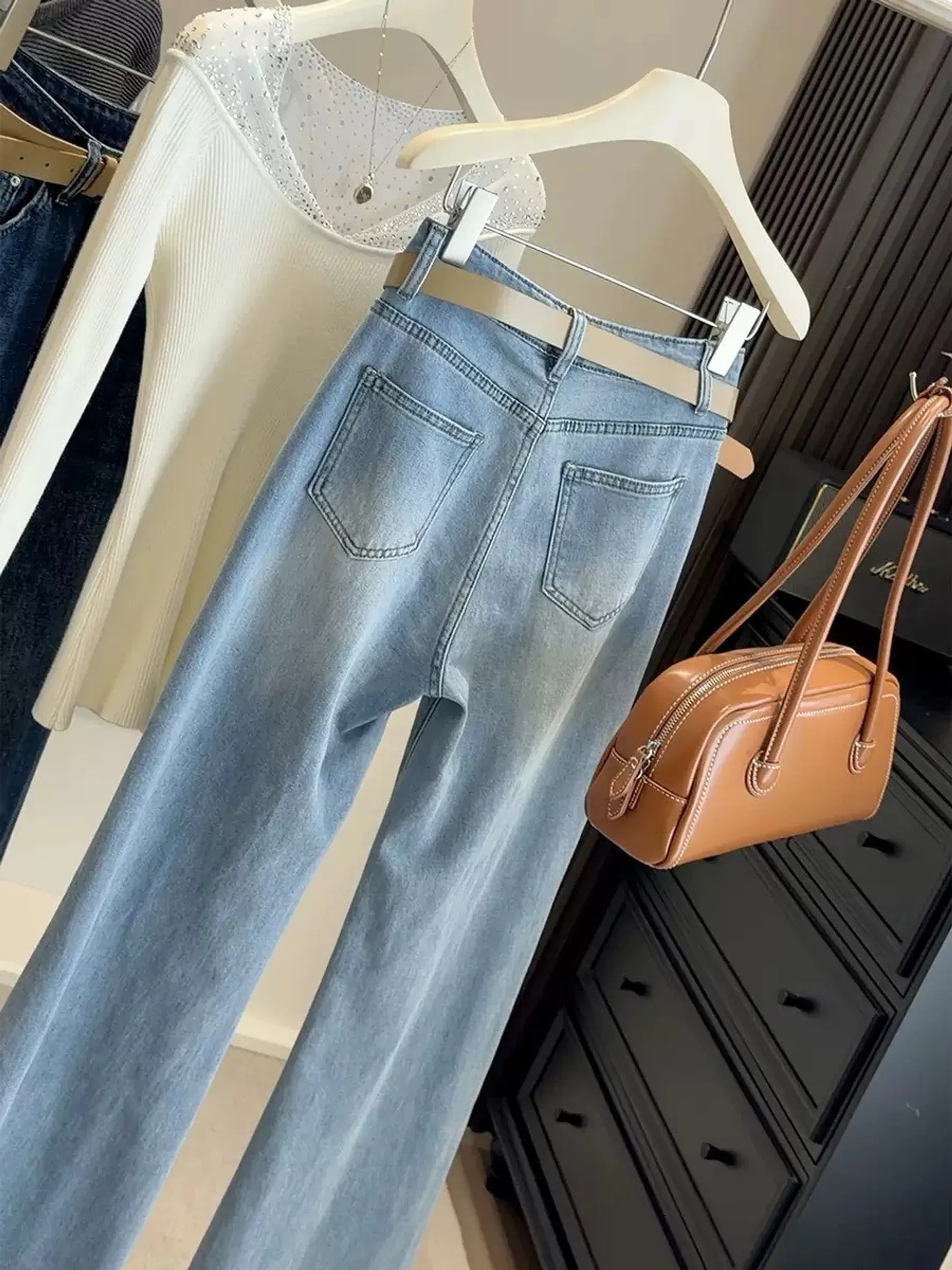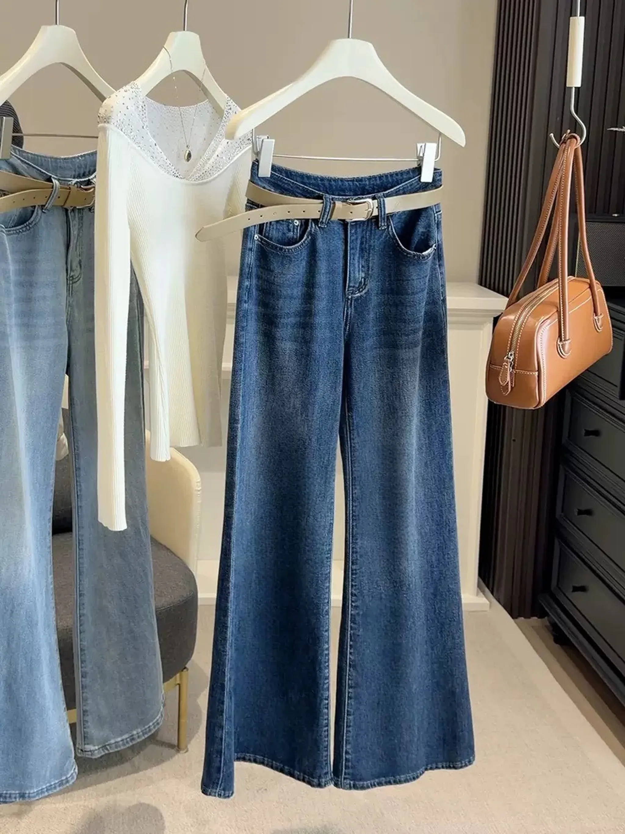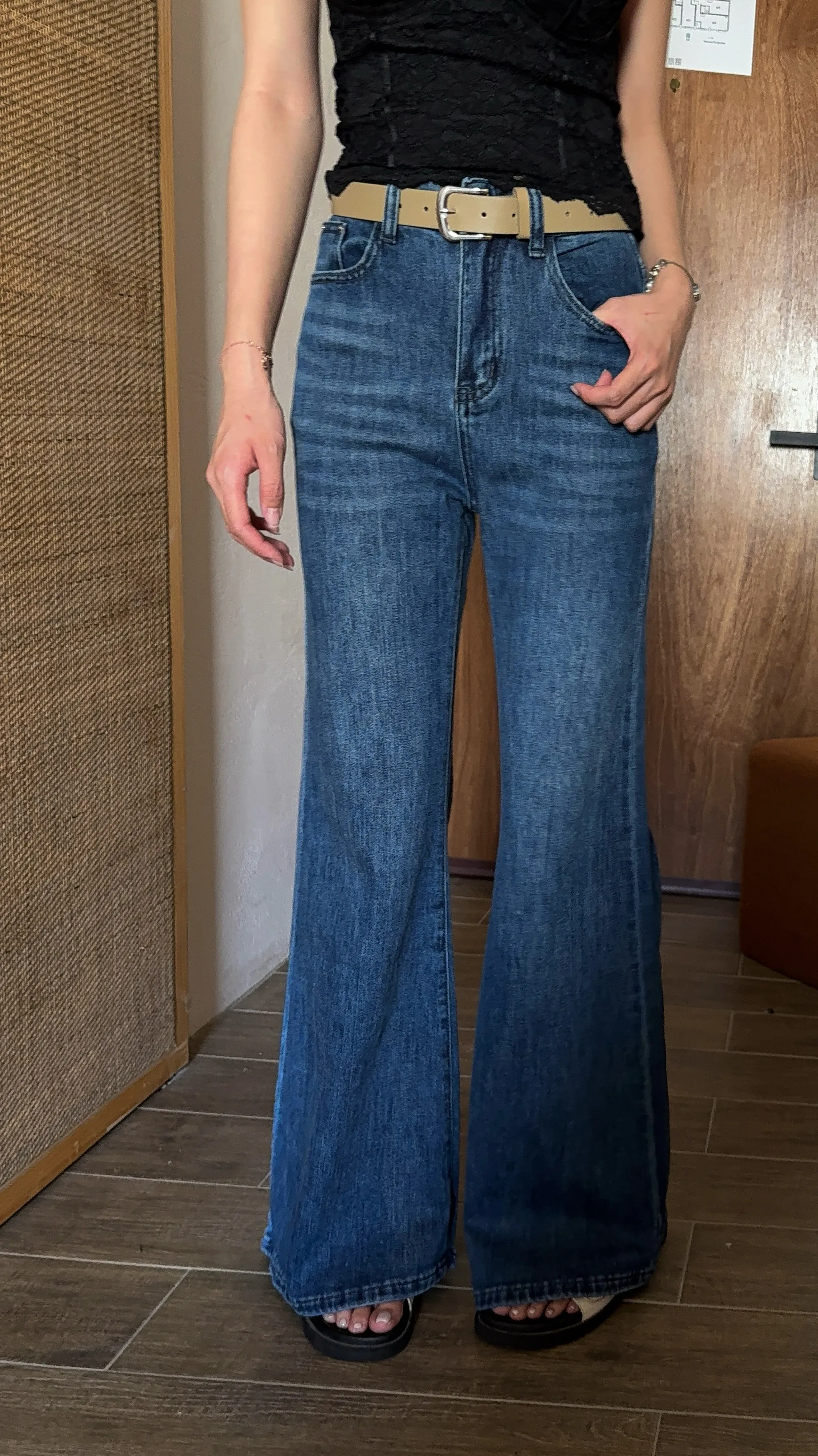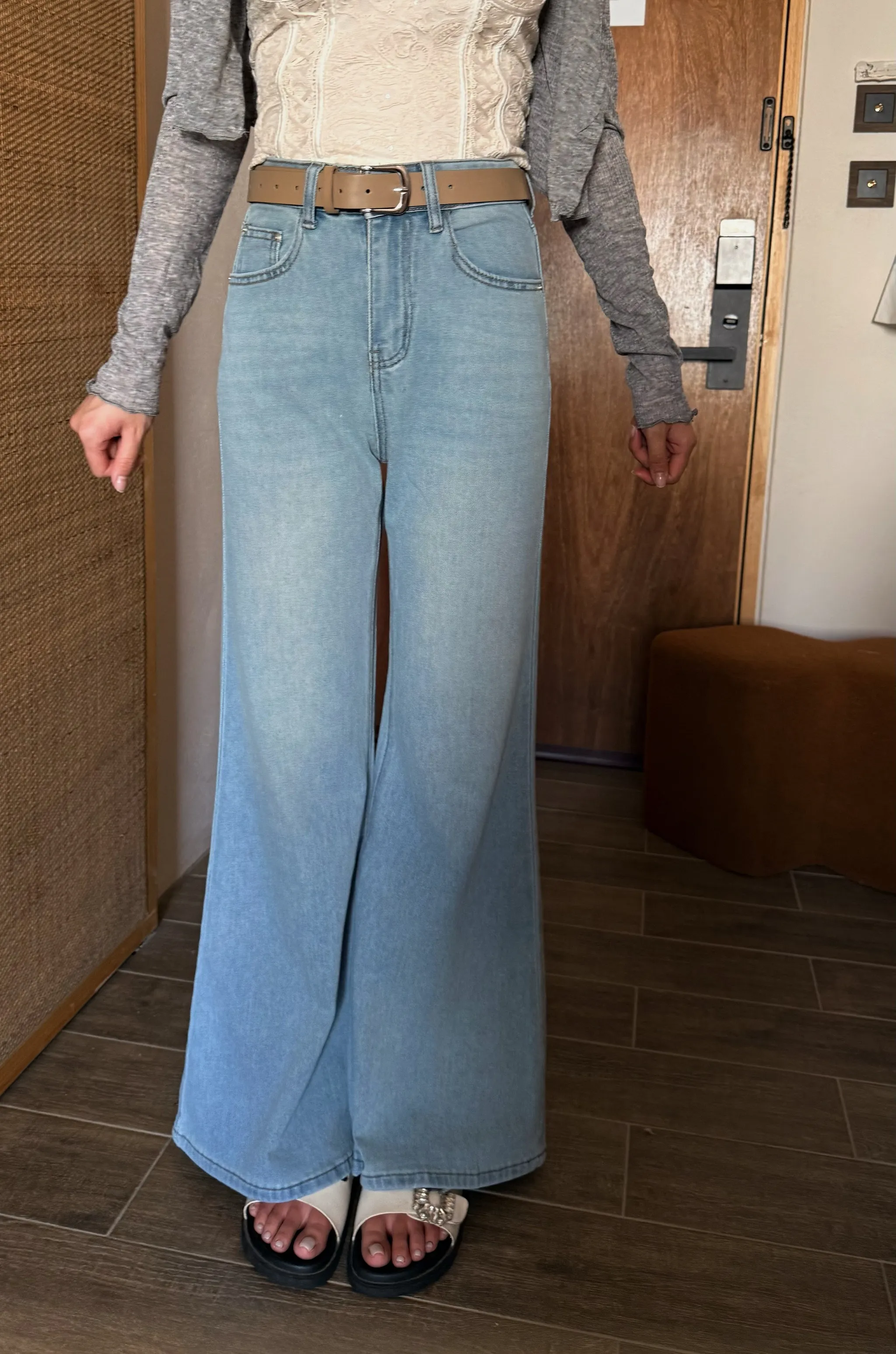 4/19收單-高腰超修飾彈力牛仔寬褲(附皮帶)