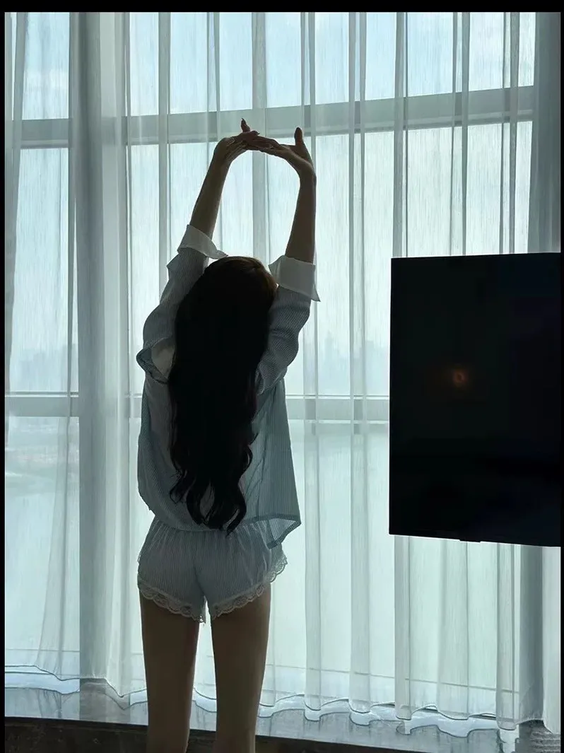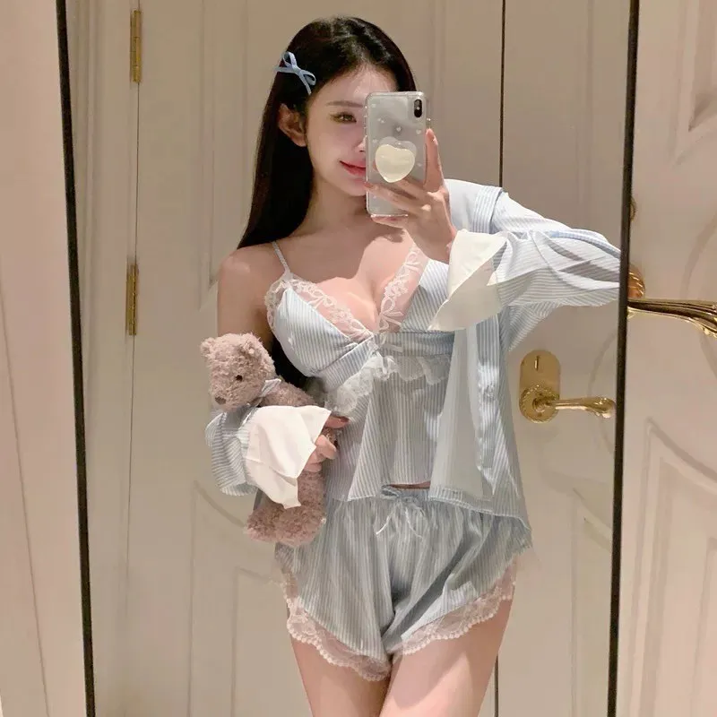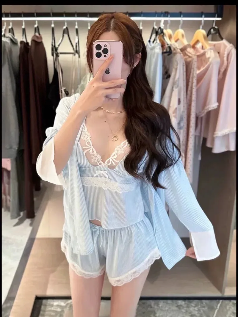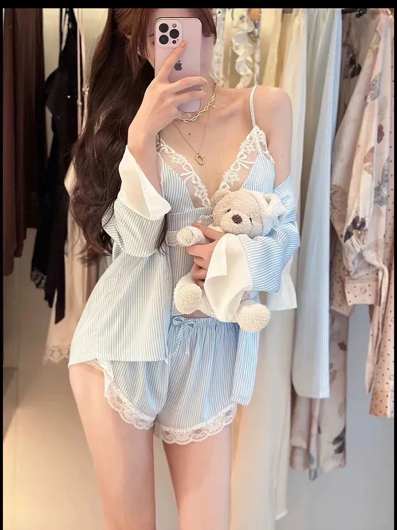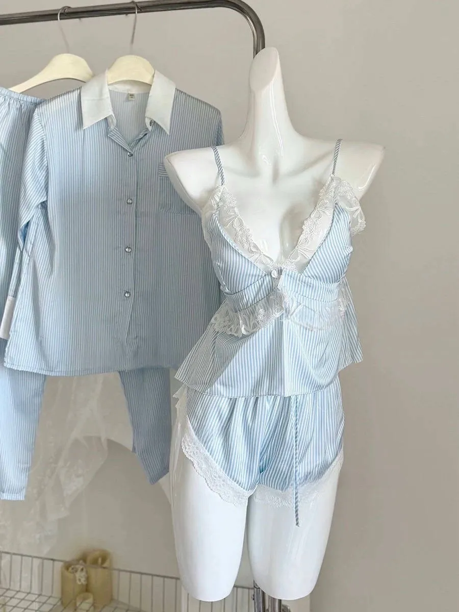 熱銷加開-莫內晨光條紋蕾絲睡衣4件SET
