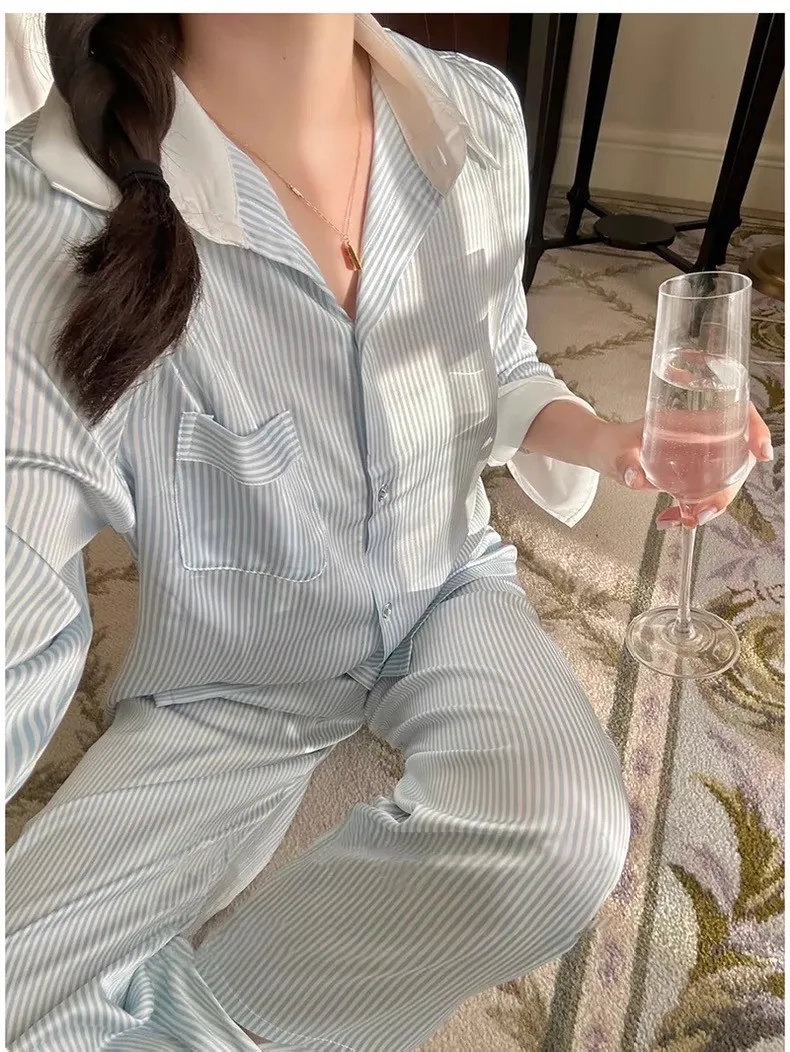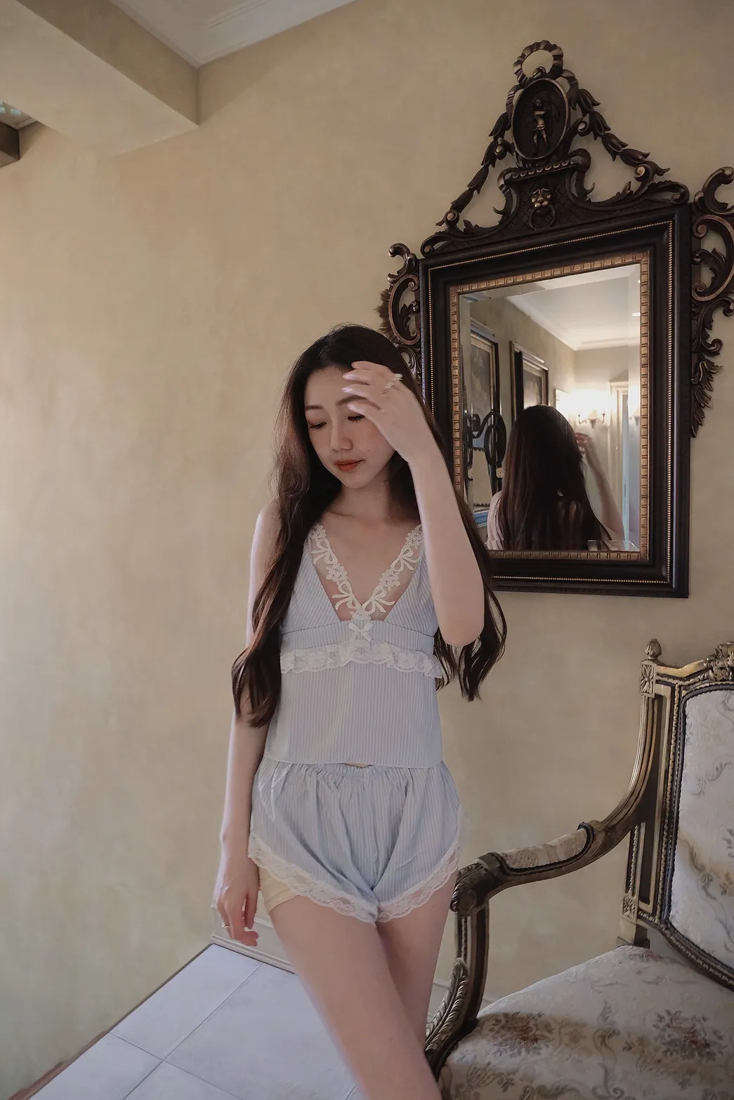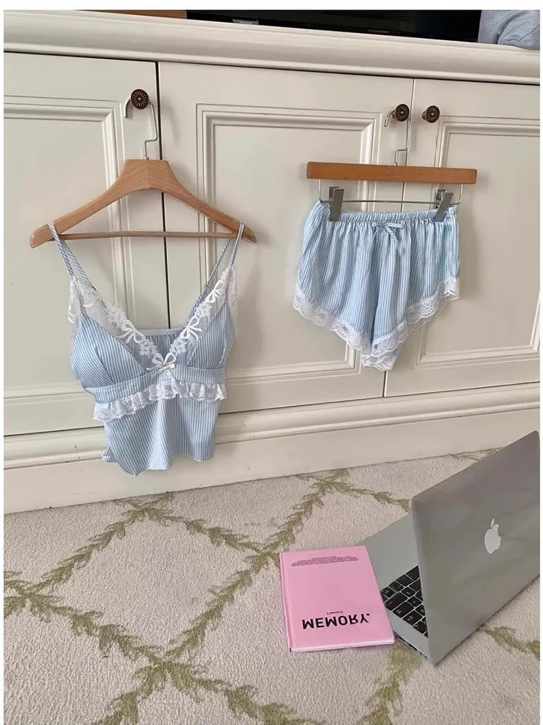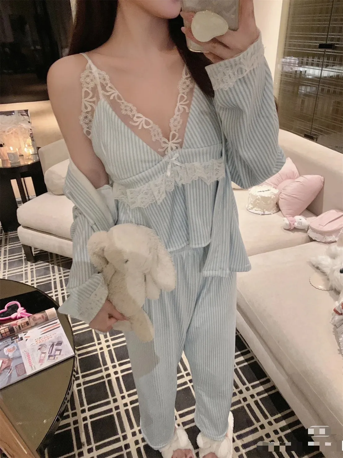 熱銷加開-莫內晨光條紋蕾絲睡衣4件SET